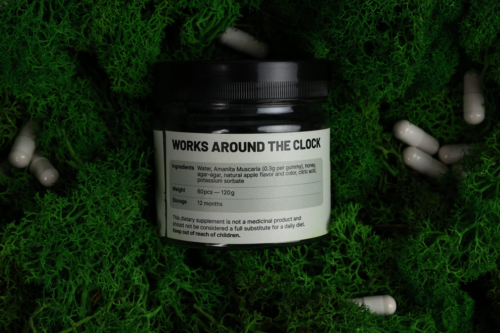 Each gummy contains 0.3g of Amanita Muscaria (Fly Agaric). The daily dosage is 1 to 3 gummies, which can be taken all at once or gradually throughout the day.