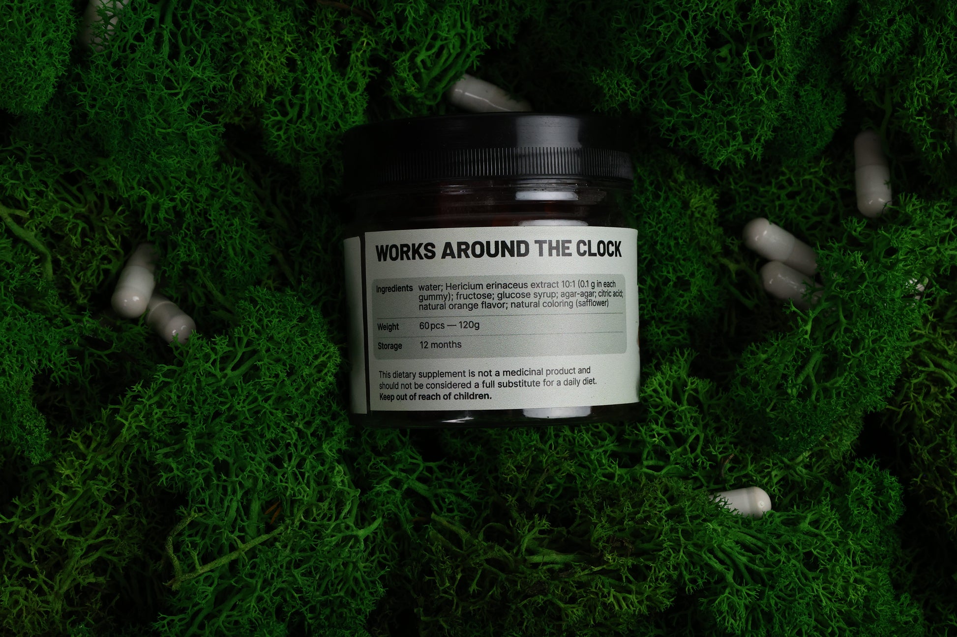 Each gummy contains 0.1 g of Hericium erinaceus (Lion’s Mane) extract. The daily dose ranges from 1 to 3 gummies. You can take them all at once or gradually throughout the day. Properties of Hericium in the gummies The main active ingredient in these treats is the Lion’s Mane mushroom. Laboratory studies have shown that it contains interesting biologically active compounds such as hericenones, erinacines, as well as a significant amount of amino acids, proteins, and rare vitamins.